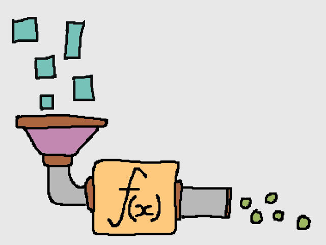 The inputs and outputs are complex data that represent something in the real world. I think about the inputs and outputs as abstract data shapes. I might start with a nested map that needs to be transformed into a sequence of sub-selections. Data comes in one shape and goes out another. Squares in, circles out.